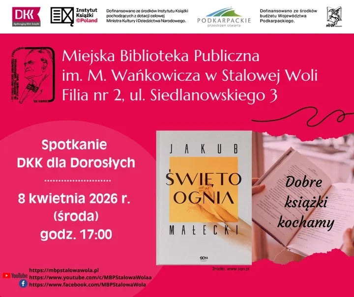 Stalowa Wola szykuje się na wieczór z książką, która nie zostawia czytelnika obojętnym 📚 W środę, 8 kwietnia w Filii nr 2 spotka się Dyskusyjny Klub Książki dla Dorosłych, a na stole pojawi się „Święto ognia” Jakuba Małeckiego - powieść, która zagląda w pamięć, pragnienia i te rodzinne sprawy, o których zwykle mówi się najciszej.