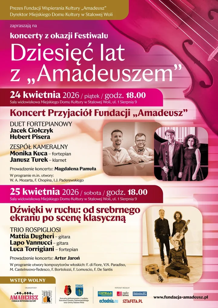 Do Miejskiego Domu Kultury w Stalowej Woli wraca muzyka, która łączy scenę, pasję i lokalną historię. W piątek i sobotę, 24 i 25 kwietnia 2026 roku, publiczność usłyszy dwa koncerty przygotowane z okazji 10-lecia Fundacji “Amadeusz” - a wejście na oba wieczory jest wolne 🎶